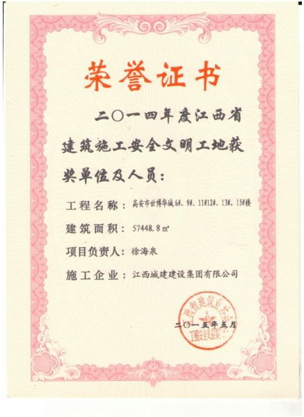 2015年5月,高安市世博华城工程“7#、8#、10#楼”、“6#、9#、11#、12#、13#、15#楼”荣获“2014年度江西省建筑施工安全文明工地”奖。